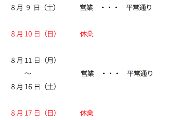 弊社ではお盆期間中も下記の通り平常通り営業いたしております。