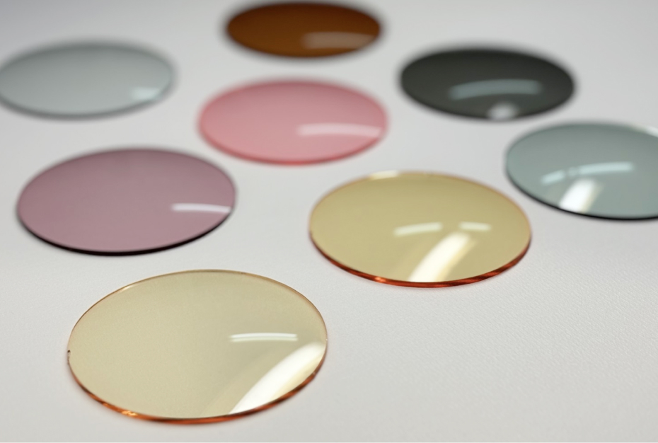 ブラウンとグレーの2カラーで屋外使用時には60~70%の濃さになる、調光剤練込タイプの調光レンズ。